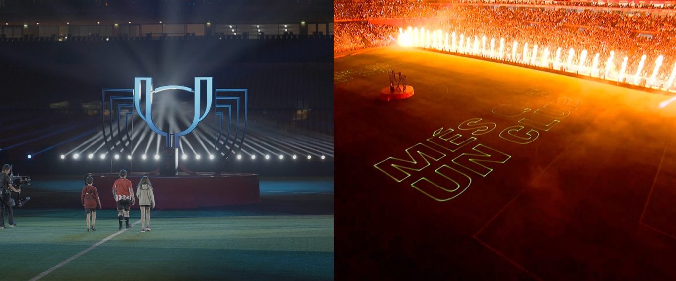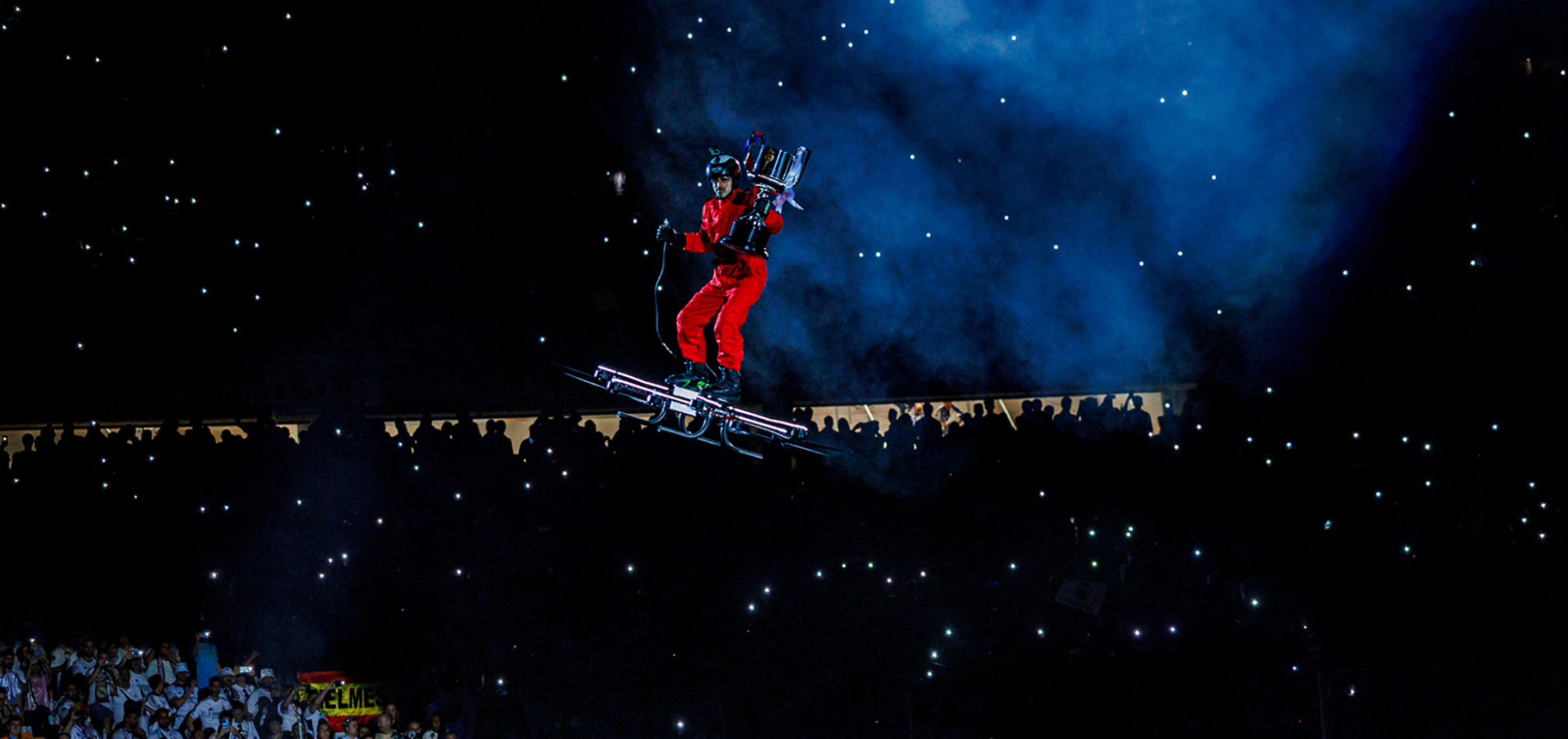El 26/4/2025, Sevilla vivió de una de las ceremonias inaugurales más impactantes en la historia del fútbol español... con solo 15 días de preparación. La propuesta creativa giraba en torno a hacer desaparecer la Copa y devolverla al estadio de forma espectacular. Y la respuesta fue tan arriesgada como memorable: un “Flyman” pilotando un hoverboard sobrevoló el Estadio de La Cartuja con la Copa del Rey en sus manos, ante la mirada atónita de miles de aficionados y millones de espectadores. La imagen, nunca antes vista en España, se volvió viral en cuestión de minutos. Arrancando con un black out total y siguiendo con un viaje audiovisual de la Copa por Sevilla, culminando con su llegada en directo al estadio y aterrizando en el círculo central. A partir de ahí, comenzó un show envolvente: más de 250 focos robotizados, 120 máquinas de efectos especiales, una estructura monumental y un diseño lumínico y sonoro coreografiado al milímetro. Láseres, fuego, música y emoción llenaron el estadio en una presentación de jugadores vibrante.